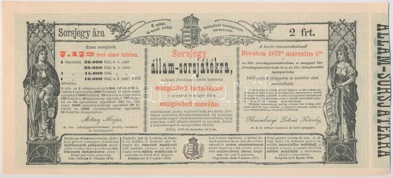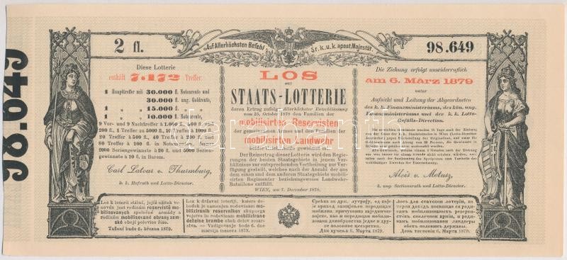 Ausztria / Bécs 1878. "Sorsjegy állam-sorsjátékra a közös hadsereg mozgósított tartalékosai s az osztrák és magyar állam mozgósított honvédei családjai javára" T:I- Austria / Vienna 1878. "State Lottery Ticket for the Reservist of the Joint Army and the Families of the mobilized Honved's" C:AU