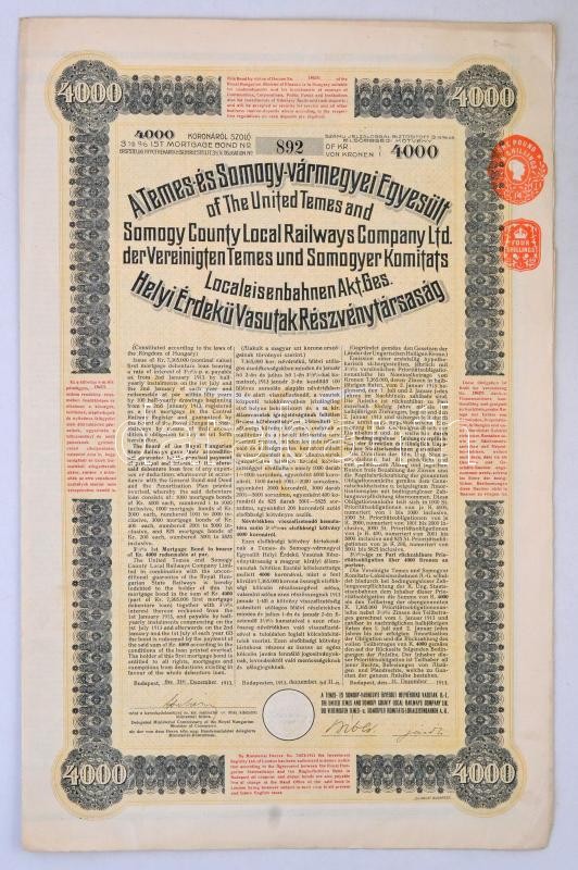 Budapest 1913. "A Temes- és Somogy-vármegyei Egyesült Helyi Érdekű Vasutak Részvénytársaság" részvénye 2000K-ról, angol, magyar és német nyelven, szárazpecséttel T:II-