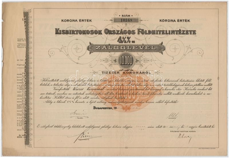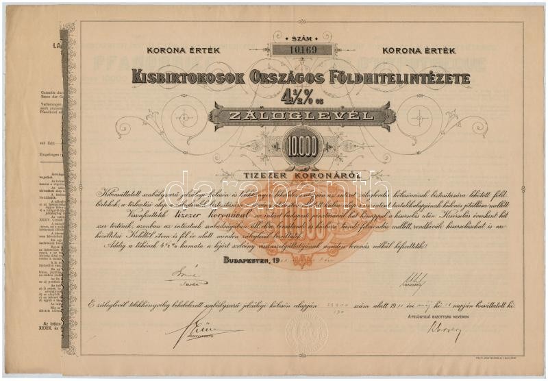 Budapest 1917. "Kisbirtokosok Országos Földhitelintézete" 4 1/2%-os záloglevele 2000K-ról, magyar, német és francia nyelven, szárazpecséttel (2x) sorszámkövetők T:III