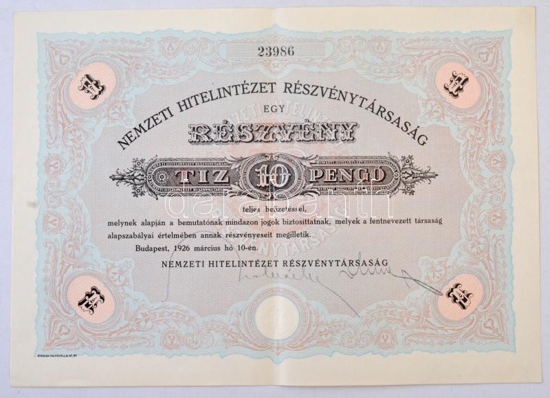 Leírás: Budapest 1926. "Nemzeti Hitelintézet Részvénytársaság" részvénye 10P-ről szárazpecséttel T:II