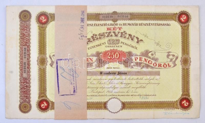 Leírás: Budapest 1934. "Gschwindt-féle Szesz-, Élesztő-, Likőr- és Rumgyár Részvénytársaság" részvénye 250P-ről, szelvényekkel és szárazpecséttel T:III