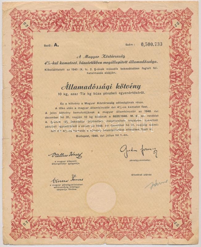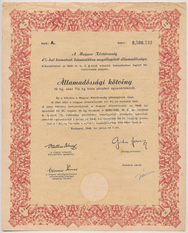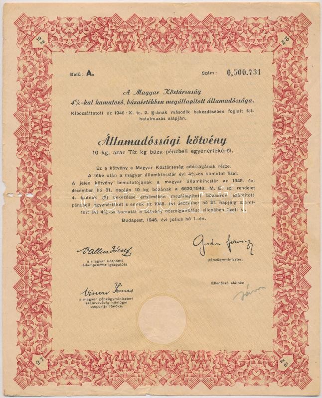 Budapest 1946. "A Magyar Köztársaság 4%-al kamatozó búzaértékben megállapított államadóssága" 10kg búza pénzbeli egyenértékéről (3x) sorszámkövetők, szárazpecséttel T:III-