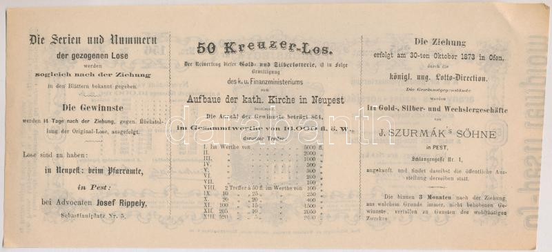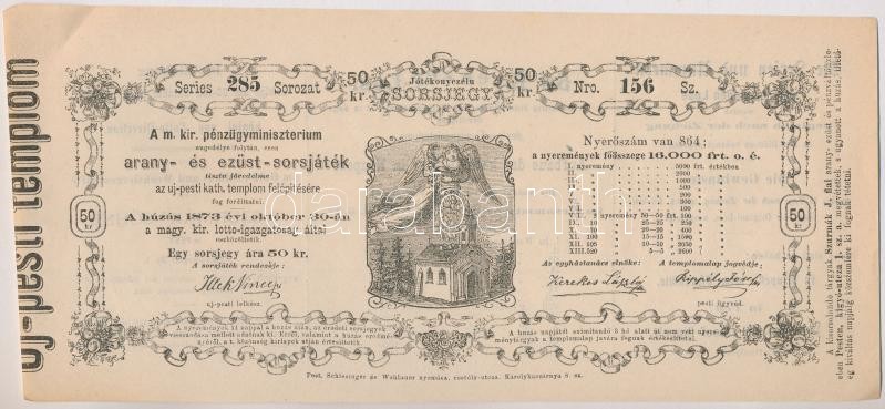 Leírás: Budapest / Pest 1873. "Jótékonyczélú Sorsjegy - Az uj-pesti kath. templom felépítésére" 50kr értékű sorsjegy T:I-