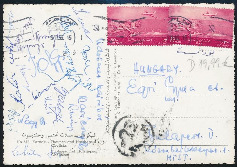 1963 Budapest Honvéd labdarúgó csapatának (Tichy, Balogh, Nagy) és Kispéter Mihály edző aláírásai egy Egri Gyula MTS elnöknek Kairóból küldött képeslapon.