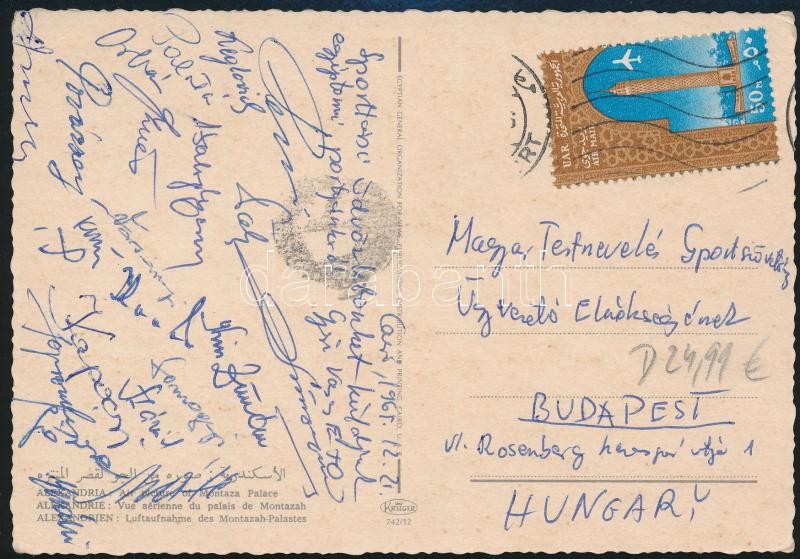 Leírás: 1965 Győri Vasas ETO labdarúgó csapatának aláírásai (Kelgovich, Povázsai, Palotai, Orbán, ..stb.) egy Kairóból az MTS-nek küldött képeslapon