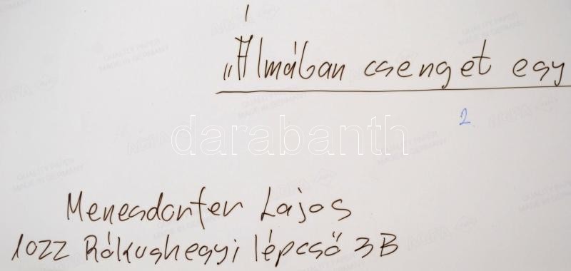 Leírás: cca 1990 Menesdorfer Lajos (1941-2005) budapesti fotóművész hagyatékából, feliratozott, vintage fénykép (Álmában csenget egy picit), 40x30 cm