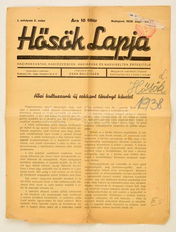 1938 A Hősök Lapja I. évfolyam 2. szám. https://www.darabanth.com/hu/331-Gyorsarveres/331.0/Festmeny-mutargy-papirregiseg-egyeb/Militaria~500027/1938-A-Hosok-Lapja-I-evfolyam-2-szam~II1845912