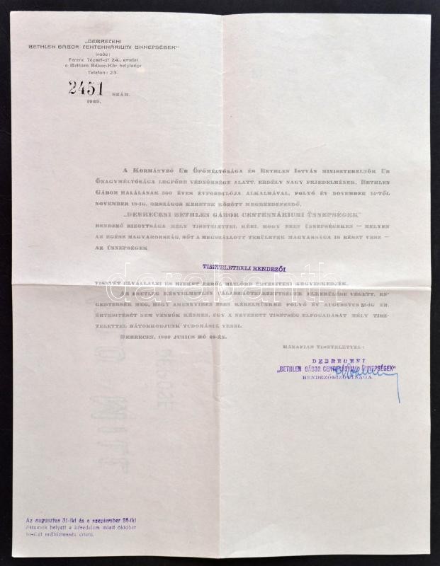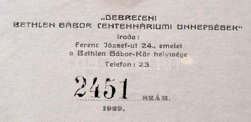 Leírás: 1929 Debrecen, Bethlen Gábor centenáriumi ünnepség tiszteletbeli rendezői felkérés. Sorszámozott de nem névre szóló