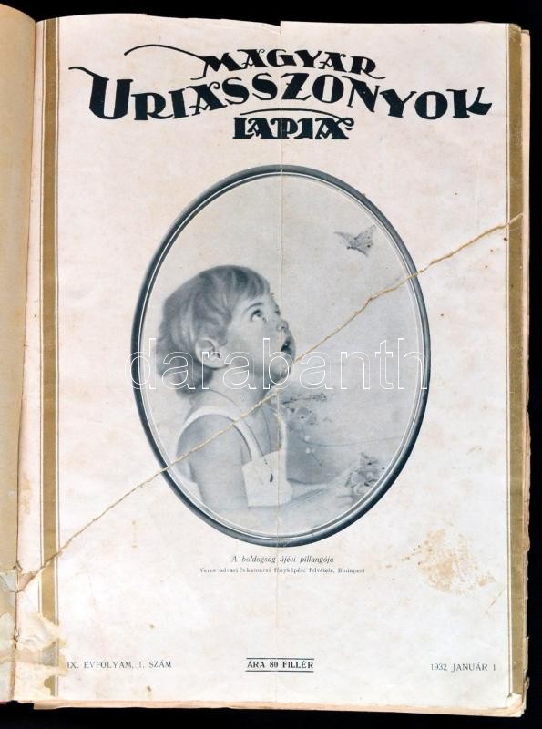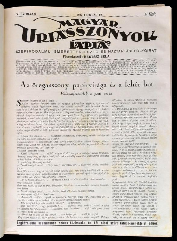 1932 Magyar Uriasszonyok Lapja, IX. évf. 1-18 . szám. Szerk.: Kertész Béla. Számos illusztrációval, köztük színes divat rajzokkal is. Félvászon-kötésben, kopott borítóval, sérült gerinccel, néhány kijáró lappal.