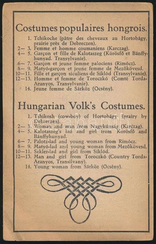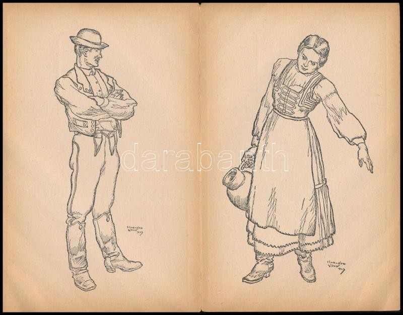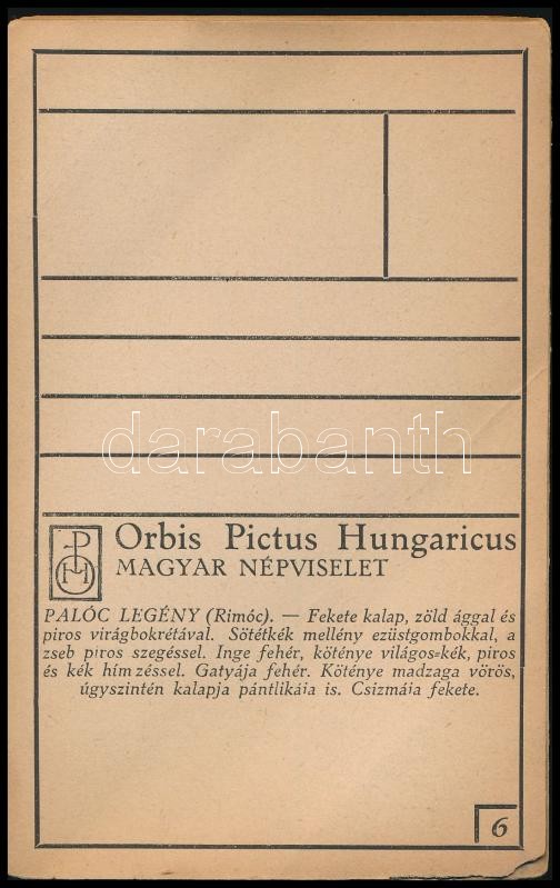 cca 1920-1930 Magyar Népviselet. Rajzolta Horváth Jenő. Orbis Pictus Hungaricus. Szerk.: Czakó Elemér. Bp., é.n., Magyar Vöröskereszt Ifjúsági Osztálya, 9 t. A rajzok hátoldalán a tájegységek viseletének leírásával. 6. Palóc legény, 7. Palóc menyecske, 8. Matyó menyecske, 9. Mezőkövesdi legény, 10. Székely legény, 11. Székely leány, 12. Toroczkói férfi, 13. Toroczkói leány, 14. Sárközi menyecske. A címlap és öt lap hiányzik.