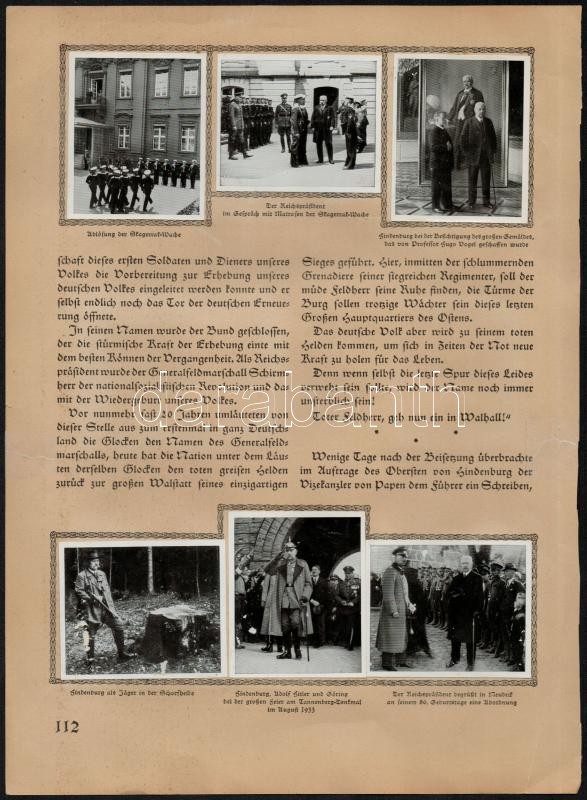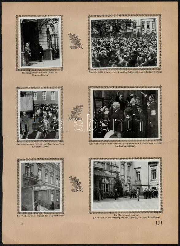 cca 1933 Hindenburgot ábrázoló náci propaganda cigaretta gyűjtőképek, gyűjtőfüzet lapra ragasztva, 12 db / 12 nazi propaganda cigarette collector's card