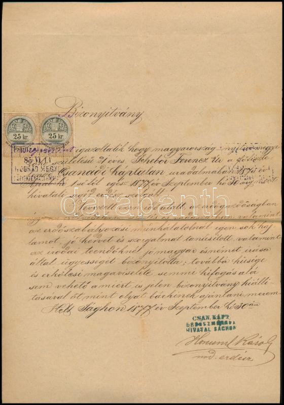 Leírás: 1877 Ság, Erdész bizonyítvány a csanádi káptalan pecsétjével