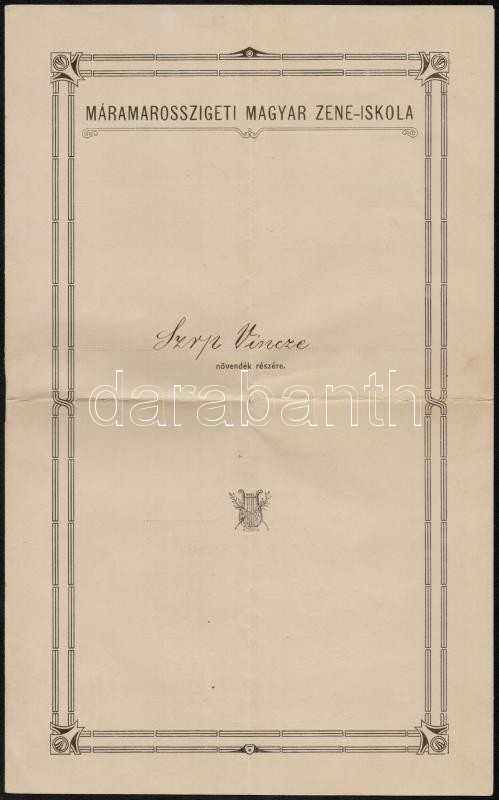 1910 Máramarosszigeti Magyar Zene Iskola bizonyítvány, okmánybélyeggel https://www.darabanth.com/hu/331-Gyorsarveres/331.0/Festmeny-mutargy-papirregiseg-egyeb/Okmanyok~500016/1910-Maramarosszigeti-Magyar-Zene-Iskola-bizonyitvany-okmanybelyeggel~II1845353