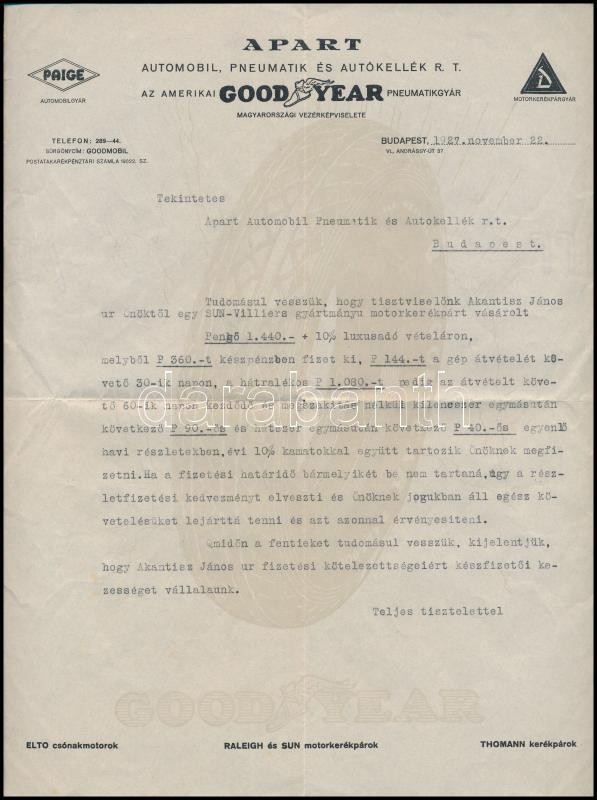 1927 Bp., Az Apart automobil, Pneumatik és Autókellék Rt., a Good Year képviselÅ‘je által Ãrt kezességvállaló levél, egyik alkalmazottjuk Sun-Villiers tÃpusú motorkerékpár vásárlása ügyében