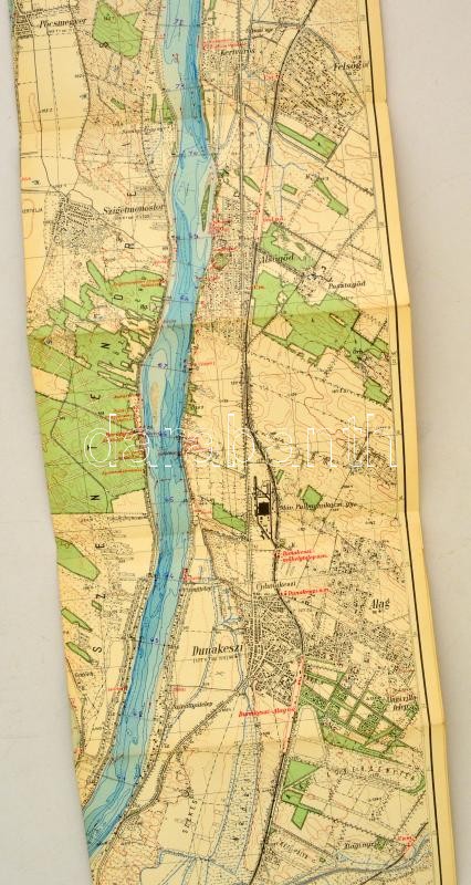Leírás: Vízi sporttérképek 5.: a Duna a Budapest-Vác szakaszának térképe, 1:25000, M. Kir. Állami Térképészet, vászonra ragasztva, 42×192 cm