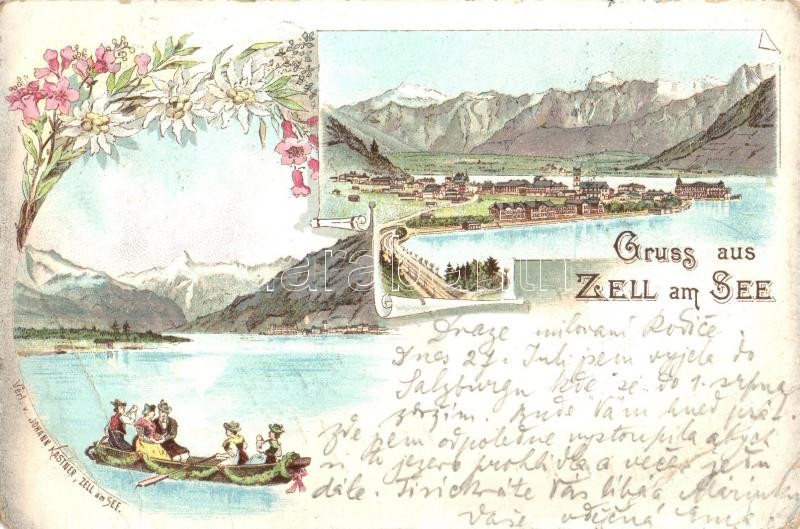Leírás: 1896 (Vorläufer!) Zell am See, general view, church, rowing boat. Verl. v. Johann Kastner. Art Nouveau, floral, litho (EB)