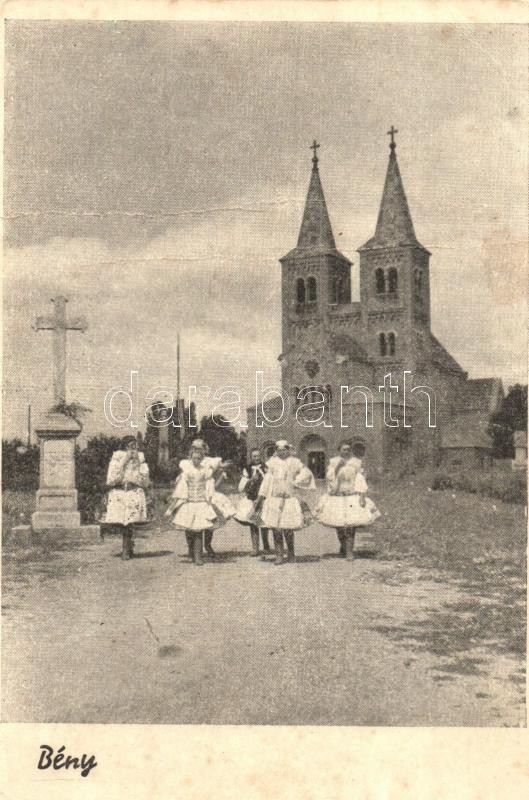 Leírás: Bény, Bína; Római katolikus templom, hölgyek népviseletben, folklór / Catholic church, ladies in traditional costumes, folklore (fa)