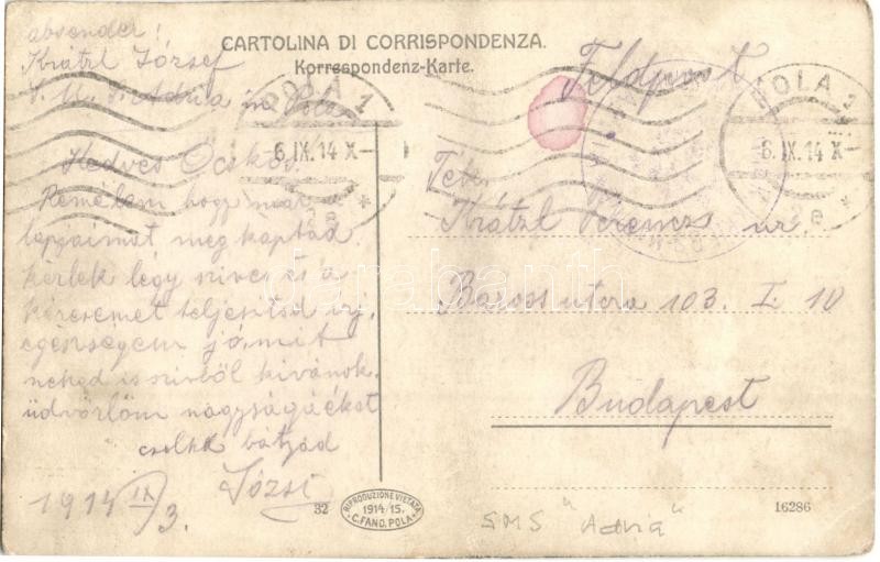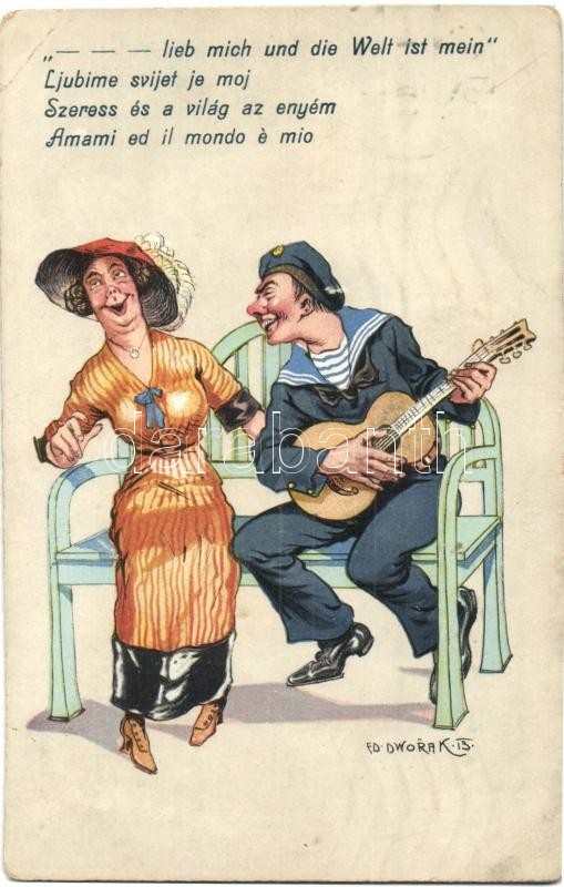 Lieb mich und die Welt ist mein / Ljubime svijet je moj / Szeress és a világ az enyém / Amami ed il mondo e mio / Austro-Hungarian Navy K.u.K. Kriegsmarine humorous mariner art postcard. C. Fano, Pola. 1914/15. s: Ed Dworak + 1914 K.u.K. Kriegsmarine SMS Adria (EK)