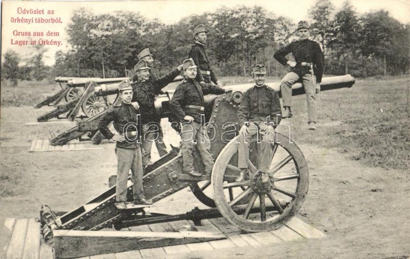 Leírás: Üdvözlet az örkényi táborból / Gruss aus dem Lager in Örkény / K.u.K. military barracks, soldiers posing on cannon