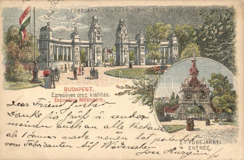 Leírás: 1897 Budapest XIV. Városliget, Ezredéves Országos Kiállítás, főbejáratok, barna 2 Kr. Ga s: Morelli, Dörre T. (EK)