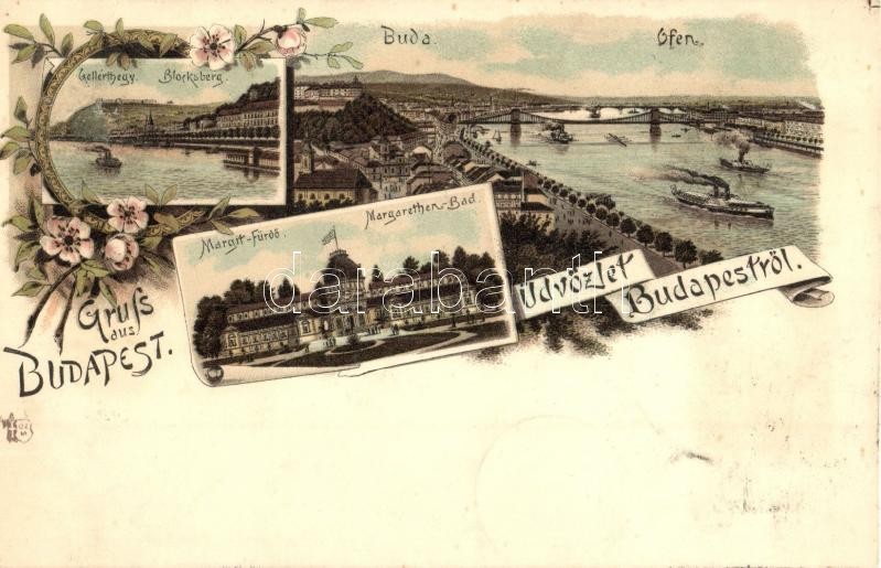 Leírás: 1897 (Vorläufer!) Budapest, Buda, Margit fürdő, Gellérthegy, gőzhajó. Ottmar Zieher Art Nouveau, floral, litho