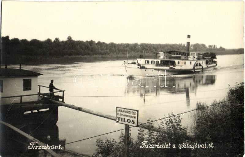 Leírás: Tiszakürt, Tisza részlet a Tahi gőzüzemű oldalkerekes személyhajóval. "A hajó kikötése előtt a hídra lépni tilos" tábla. photo