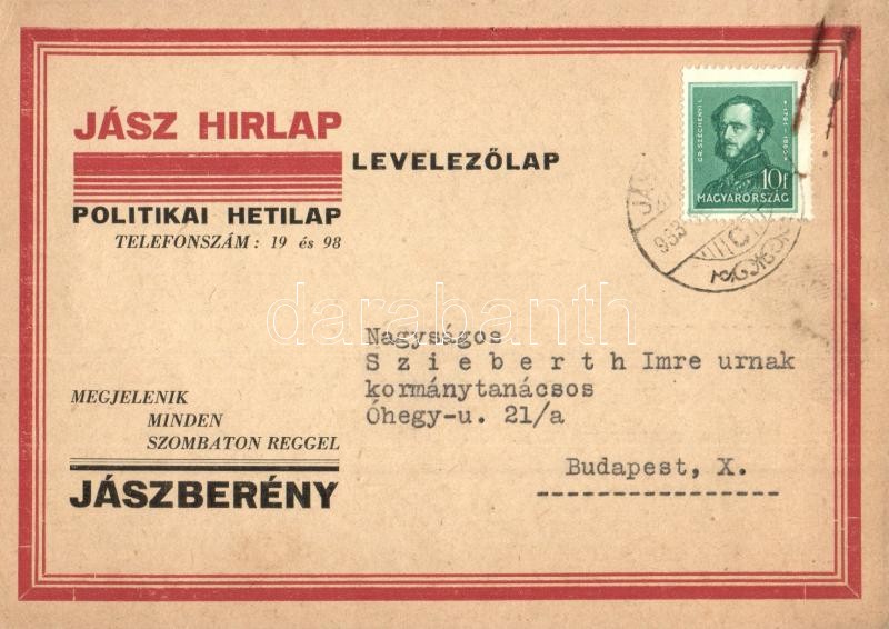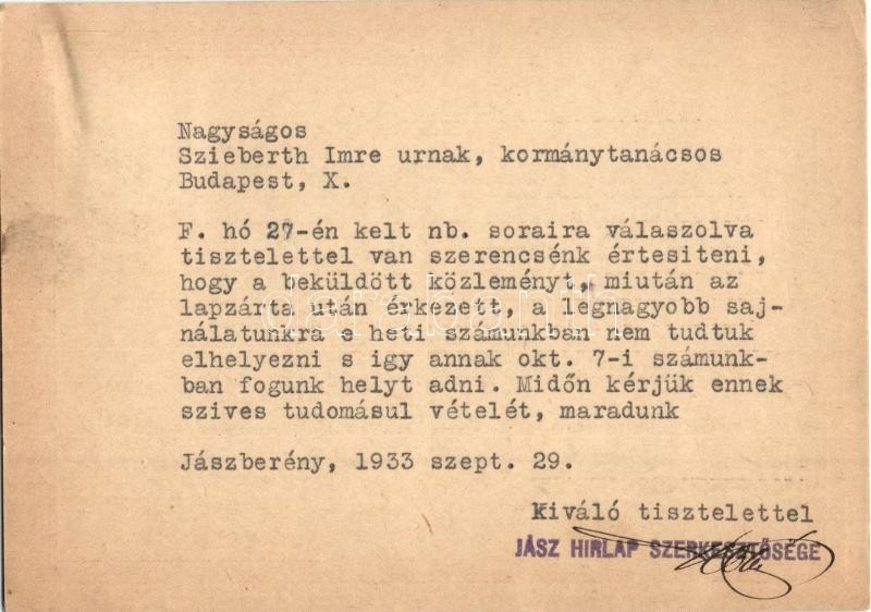1933 Jászberény, Jász Hírlap politikai hetilap reklámlap. A szerkesztőség levele Szieberth Imre kormánytanácsos úrnak / Hungarian provincial political weeky magazine.