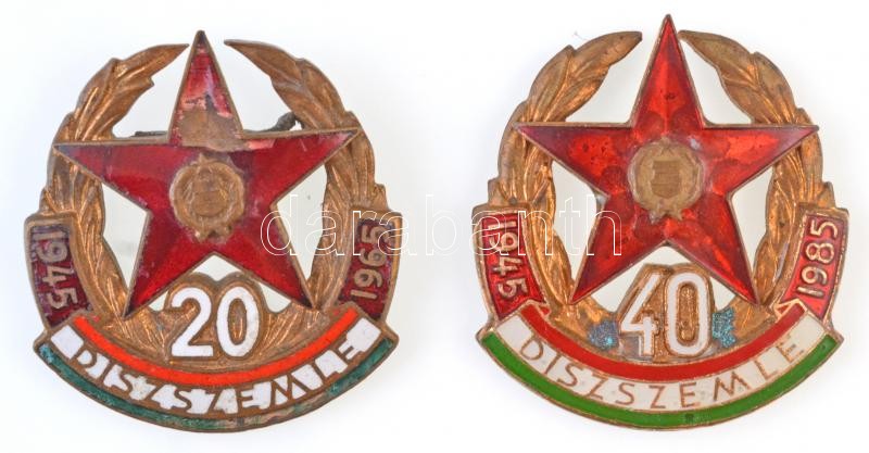Leírás: 1965. "1945-1965. 20. Díszszemle" + 1985. "1945-1985. 40. Díszszemle" zománcozott fém jelvények T:2,2- zománchiány