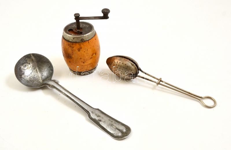 Leírás: Vegyes bolha tétel, összesen 3 db: borsdaráló, fém merőkanál és teafű kiemelő