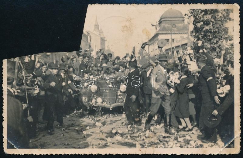 Leírás: 1940 Nagyszalonta, Bevonulás, fotólap, bal felső sarkán kivágással, 8,5×13 cm