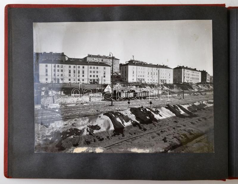 1953 Komló építése eredeti fotókon. Vas Zoltánnak, Komló kormánybiztosának készített mappa az iparosodó városról. 20 db 24x18 cm-es fotót tartalmazó album.