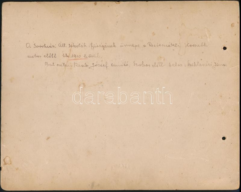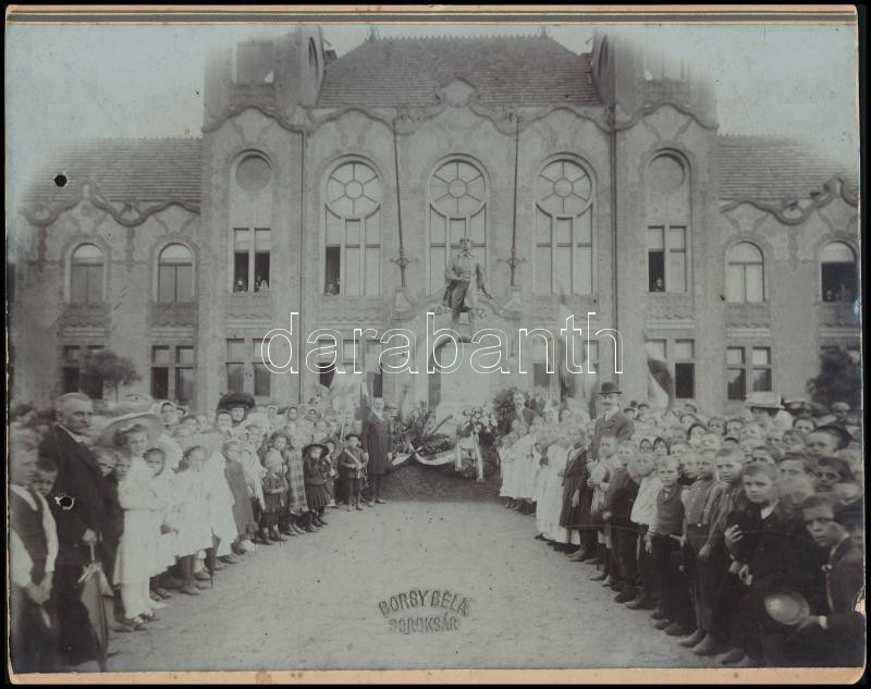 cca 1910 A Soroksári Általános Iskolák ifjúságának ünnepe a pesterzsébeti Kossuth szobor előtt, keményhátú fotó, hátoldalon feliratozva, Borsy Béla hidegpecséttel jelzett fotója, lyukasztással, szélei levágva, 18×23 cm