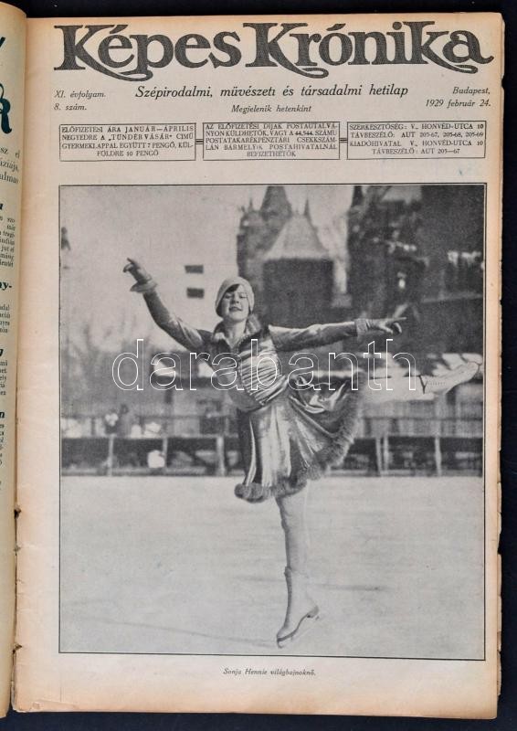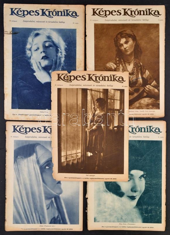 1928-1929 Képes Krónika 5 száma (X. évf. 10 szám, XI: évf. 6.,7.,8.,9. szám.) Változó, többnyire szakadozott állapotban, a XI. évf. 8. számából a lapok részben kijárnak.