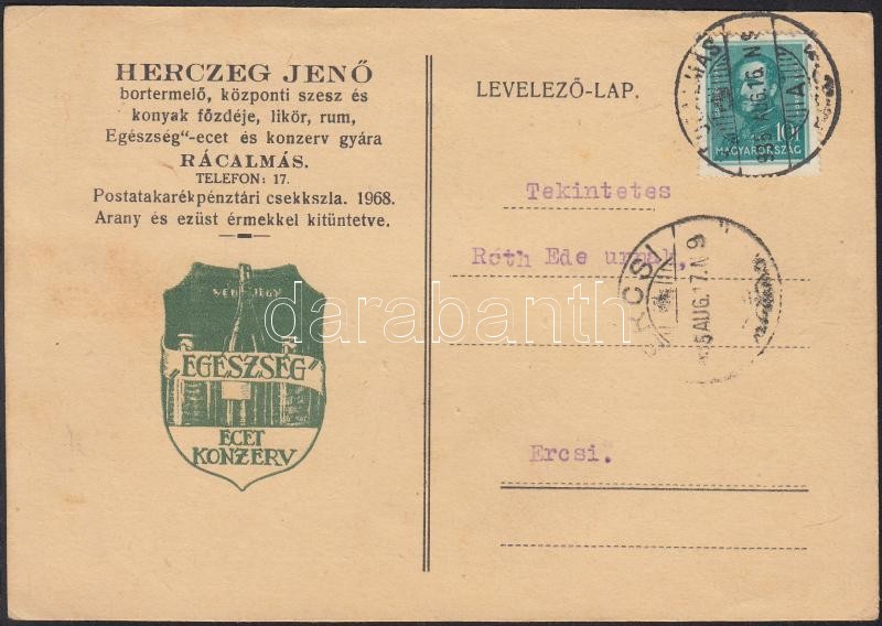 1935 Herczeg Jenő bortermelő, központi szesz és konyak főzdéje Rácalmá... https://www.darabanth.com/hu/332-Gyorsarveres/332.0/Festmeny-mutargy-papirregiseg-egyeb/Nyomtatvanyok~500030/1935-Herczeg-Jeno-bortermelo-kozponti-szesz-es-konyak-fozdeje-Racalmas-reklamos-levelezo~II1856124