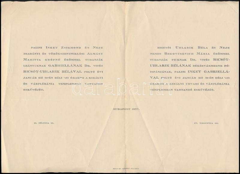 1937 palini Inkey Gabriellának és Dr. Vitéz Ricsóy-Uhlarik Bélának esk... https://www.darabanth.com/hu/332-Gyorsarveres/332.0/Festmeny-mutargy-papirregiseg-egyeb/Nyomtatvanyok~500030/1937-palini-Inkey-Gabriellanak-es-Dr-Vitez-Ricsoy-Uhlarik-Belanak-eskuvo-meghivoja-hajtC3~II1852697