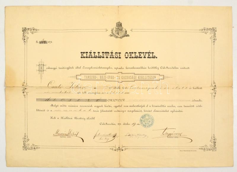 1878 Csíkszereda, Tanszer- házipar és gazdasági kiállítás elismerő okl... https://www.darabanth.com/hu/332-Gyorsarveres/332.0/Festmeny-mutargy-papirregiseg-egyeb/Okmanyok~500018/1878-Csikszereda-Tanszer-hazipar-es-gazdasagi-kiallitas-elismero-oklevele-50x36-cm~II1854349