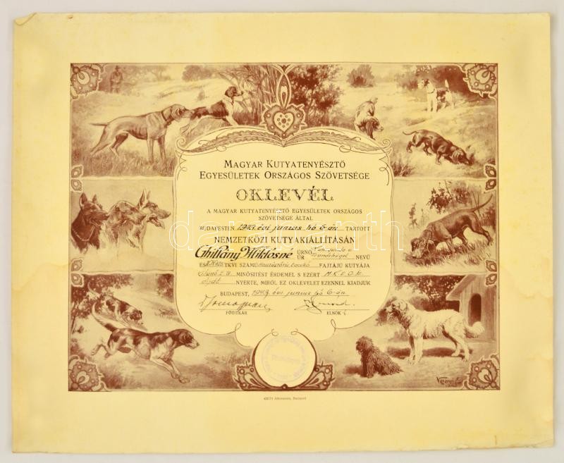 Leírás: 1943 Bp., Magyar Kutyatenyésztő Országos Egyesületek Országos Szövetsége által kiállított oklevél