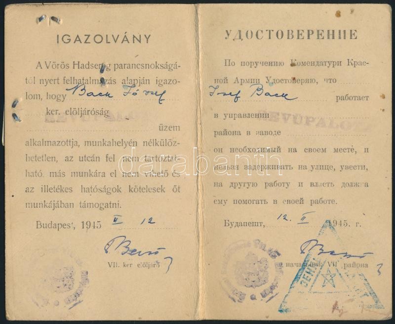 1945 Bp., Vörös Hadsereg parancsnoksága által kiállított kétnyelvű iga... https://www.darabanth.com/hu/332-Gyorsarveres/332.0/Festmeny-mutargy-papirregiseg-egyeb/Okmanyok~500018/1945-Bp-Voros-Hadsereg-parancsnoksaga-altal-kiallitott-ketnyelvu-igazolvany-fenykeppel~II1856741