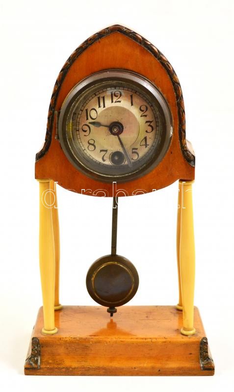 Szecessziós asztali óra, ingával, csont lábakon, fa óratesttel és talapzattal, órakulccsal, a fa testen és talapzaton kisebb kopásnyomokkal és folttal, működik, m: 24 cm, talapzat: 13x7 cm.
