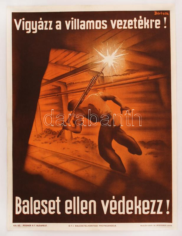 cca 1930 Börtsök László (?-?): Baleset ellen védekezz! Vigyázz a villamos vezetékre! Balesetmegelőző plakát O.T.I. Balesetelhárítási propagandája. 48x63 cm. / Anti accident poster. 48x63 cm.
