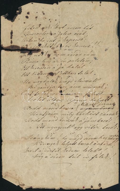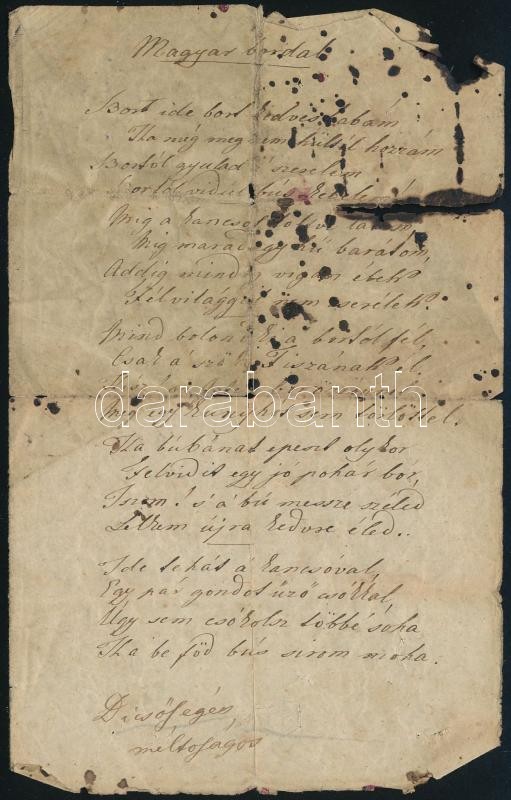 Magyar bordal, két kézzel írt bordal, foltos, sérült. https://www.darabanth.com/hu/332-Gyorsarveres/332.0/Festmeny-mutargy-papirregiseg-egyeb/Tortenelmi-dokumentumok-keziratok-erdekessegek~500019/Magyar-bordal-ket-kezzel-irt-bordal-foltos-serult~II1857624