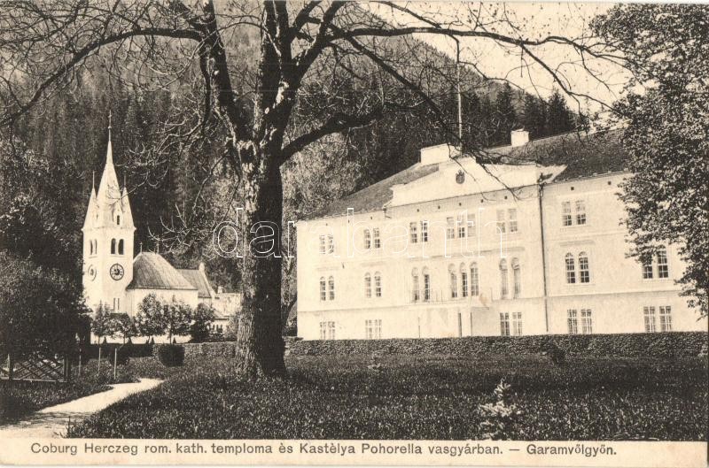 Koháryháza, Pohorella-vasgyár, Pohorelá; Coburg herceg római katolikus temploma és kastélya a Pohorella vasgyárban Garamvölgyön. Divald / Coburg castle and Catholic church by the iron works in Hron valley
