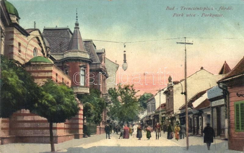 Leírás: Trencsénteplic, Trencianske Teplice; Park utca, Nádas Jenő üzlete / street view, shops