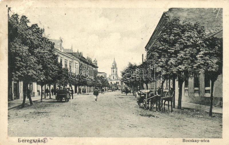 Beregszász, Berehove; Bocskay utca, templom, lovaskocsi / street view,... https://www.darabanth.com/hu/332-Gyorsarveres/332.0/Kepeslapok/Karpatalja~2000089/Beregszasz-Berehove-Bocskay-utca-templom-lovaskocsi-street-view-church-horse-drawn-carriage~II1858657