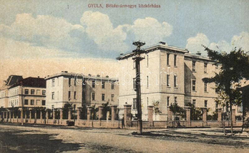 Gyula, Békés vármegye kórháza. Kiadja Dobay János (EK) https://www.darabanth.com/hu/332-Gyorsarveres/332.0/Kepeslapok/Magyarorszag~2000004/Gyula-Bekes-varmegye-korhaza-Kiadja-Dobay-Janos-EK~II1857146