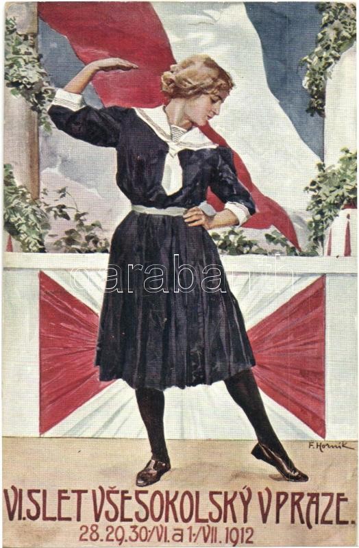 Leírás: 1912 VI. Slet Vsesokolsky v Praze / 6th Sokol festival and meeting in Prague; sports gathering art postcard. s: F. Horník (Rb)