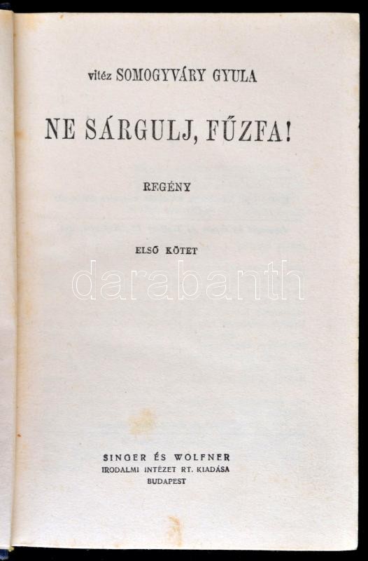 Somogyváry Gyula műveinek 12 kötete: Virágzik a mandula I-II. kötet, És Mihály harcolt I-II. kötet, Ne sárgulj fűzfa I-II. kötet, És mégis élünk I-II. kötet, A Rajna ködbevész, A város meg a sárkány, Virrasztó a ködben, Versek. Bp., 1939-1941, Singer és Wolfner. Kiadói aranyozott egészvászon-kötés, többnyire kopott borítókkal. A versek c. kötet rossz állapotban.