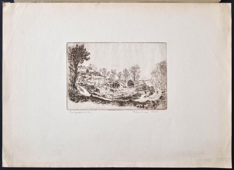 Leírás: 1955 Tuka László (1924-2007): Galgahévízi táj. Rézkarc, papír, jelzett, 9x13 cm.