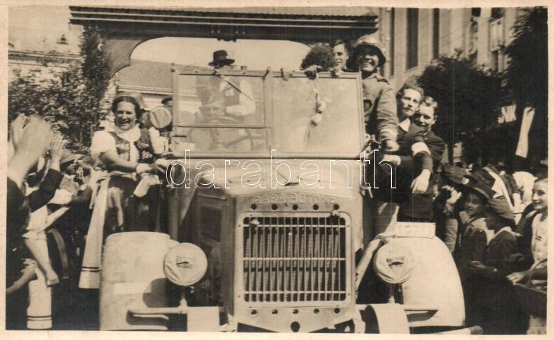 1940 Marosvásárhely, Targu Mures; bevonulás Rába-Botond katonai gépkocsival, honleány és katona az autó oldalán / entry of the Hungatian troops, military automobile. Körtesi photo