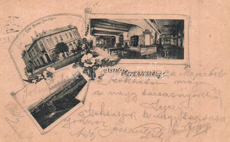 Leírás: 1899 Eperjes, Presov; Berger Kávéháza, belső biliárd asztalokkal / cafe interior with billiards tables. floral (kis szakadás / small tear)